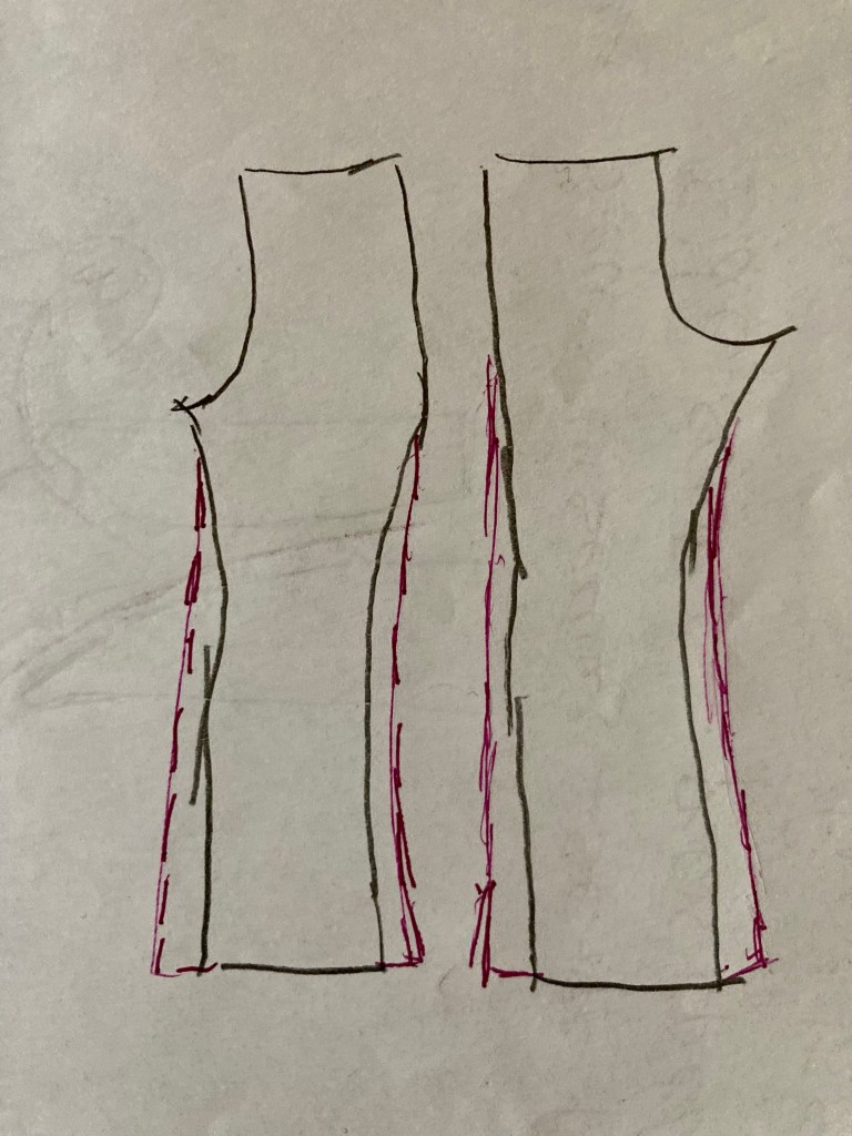 So why use this pattern anyway, with the standout seaming when I won’t include that feature? Because, the upper portion (waist, hip, crotch) is a perfect fit, from which point I could do as I liked, eliminate the paneled seams and turn this pair into boring, black wide legged pants.