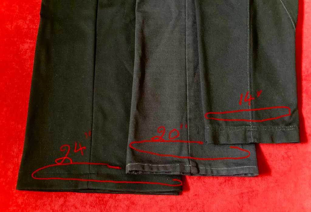 1. I suspect there is a drawing that identifies the names of the different pant widths. Boot cut vs narrow vs peg ….. but I can’t lay eyes on it at the moment.