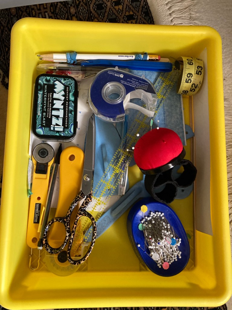 So, the cutting mat moved to the floor and under the bed, invisible to those not in the know. For cutting activities, the mat slides out. I added a bin to hold cutting and pinning tools and notions there on a semi-permanent basis. That is how the under-bed sewing/cutting spot came into being. Then the sore knee issue came up. I cannot comfortably bend my knees and sit on the floor like I used to; therefore, the cutting mat and tools have to be brought up and situated on top of the bed to cut out a project. It’s time to seriously look for a folding cutting table for my real sewing room — yes, it exists. But I am obsessing over hidden sewing spots right now. Do you have one?
