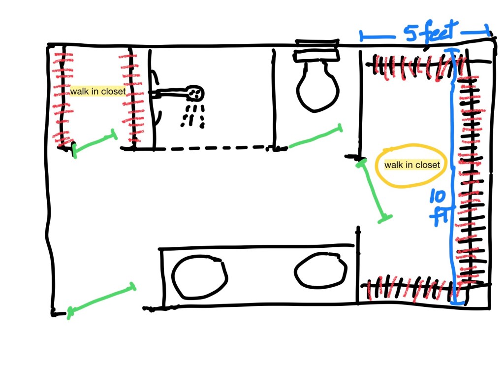 For further obsession, could I transform my walk-in closet to a hidden sewing room? Said closet can only be approached through the main (aka master) bath, which is making me look at my bathroom with new eyes. I did a rough drawing, one thing led to another and my imagination has me knocking down a wall, removing/adding a door, adding windows and skylights. Oh my!