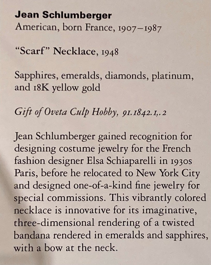 Bonus Museum Stuff! While meandering around MFAH, we found some exquisite jewelry exhibit. Take a look at this “scarf” necklace, circa 1948 by jeweler Jean Schlumberger, reminiscent of a twisted bandana.