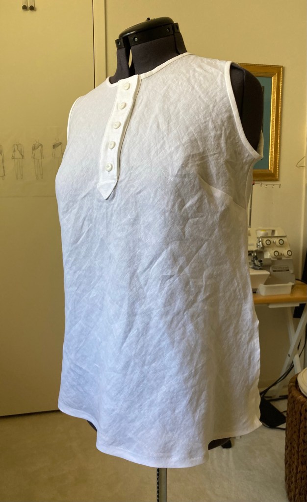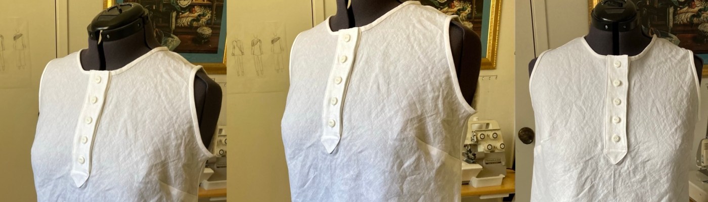 It’s cut on the bias grain, except for the placket; the placket was totally unnecessary because the top goes on easily without an opening due to wonders of the bias grain. I added the neck placket just to have a detail on the plain white, and being a sucker for making more work for myself.