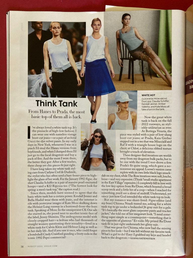 Time to make a final hot weather top. A chic little bird told me that a white knit tank top has taken a hold in the fashion crowd. You know the top —- it used to be in the men’s undershirt drawer. There’s this article in Vogue where an editor talks about it, and her favorite brand, etc., etc. I can’t find a link to it, but here’s a photo of the magazine page.