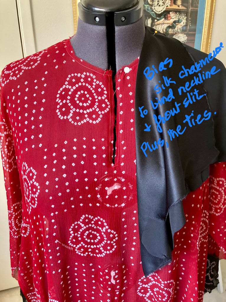 Fabric is a 25 year old crinkly rayon tie-dyed piece, made with a process called “bandini”. I bought it in Pakistan at a shop which had set up the dyer in front. I could stop and see them working. This fabric set (it came with a dupatta) was done and dried, and hanging on a display for someone to buy it. It spoke so loudly to me that I brought it Stateside to stew in the fabric stash. See? The fate of this bandini set was written 25 years ago.