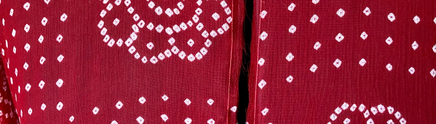 Fabric is a 25 year old crinkly rayon tie-dyed piece, made with a process called “bandini”. I bought it in Pakistan at a shop which had set up the dyer in front. I could stop and see them working. This fabric set (it came with a dupatta) was done and dried, and hanging on a display for someone to buy it. It spoke so loudly to me that I brought it Stateside to stew in the fabric stash. See? The fate of this bandini set was written 25 years ago.