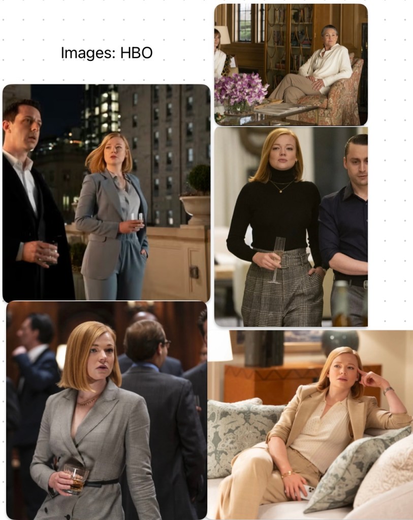 The character of Shiv in HBO Max’s “Succession”. In the last episodes I noticed that the fit of her beige blazer left much to be desired (not pictured in this montage) — maybe because the character (maybe the actress too) was pregnant? The person in the topmost photo on the right is actually the old-money character in the show.