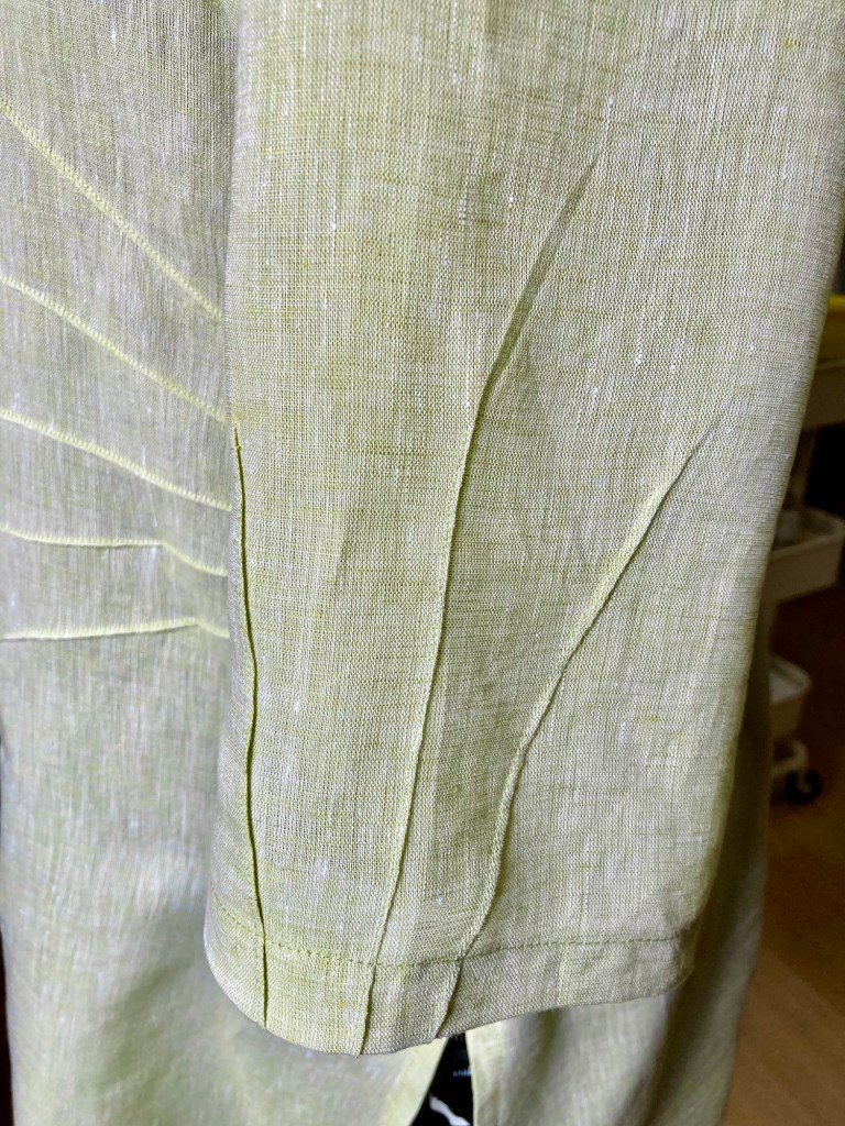 The fabric is a lightweight linen (just short of being called a handkerchief linen) in a soft pistachio green interwoven with white. I love the color! Since everything is from Deep Stash, the buttons are a bit mismatched but I like the look.