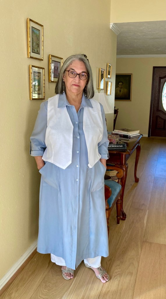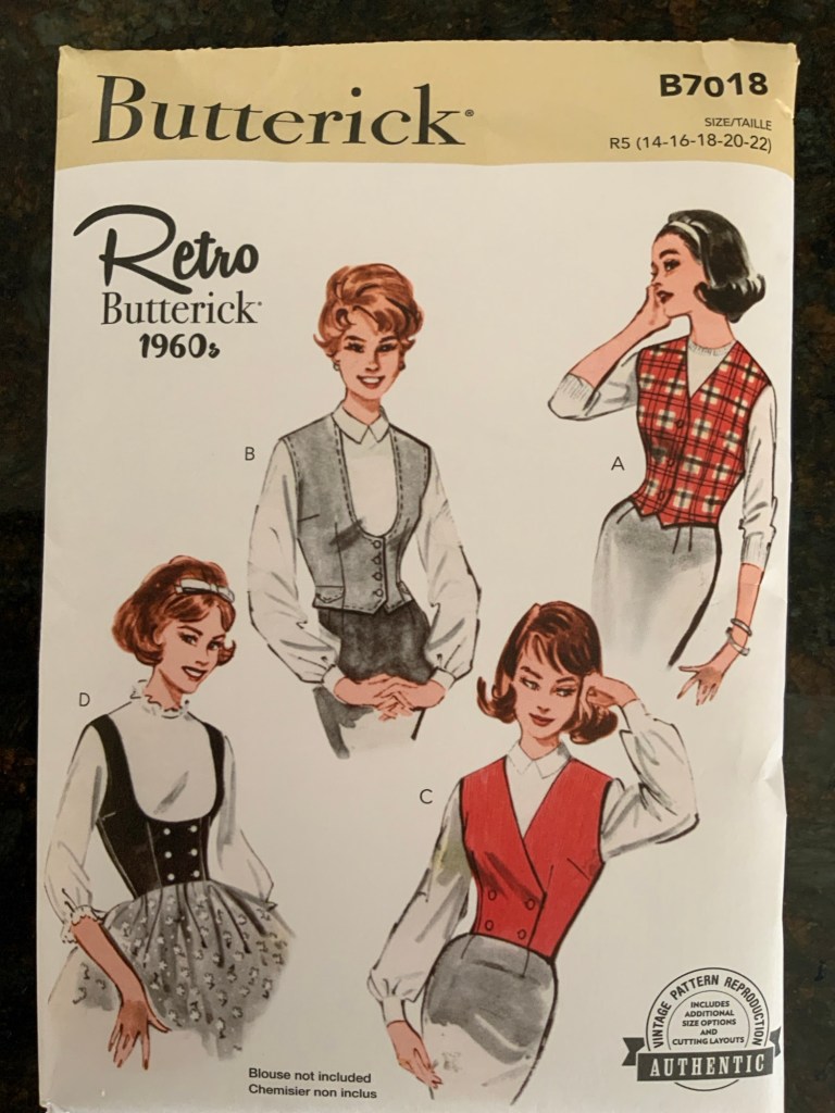 So sorry, guys — the vest I’m wearing is the muslin. I bought this re-issued 1960s McCall’s, made the usual adjustments but was not a happy camper. My plan was to use white linen. That’s a whole other blog post where my determination to make this vest fit me properly may or may not happen.