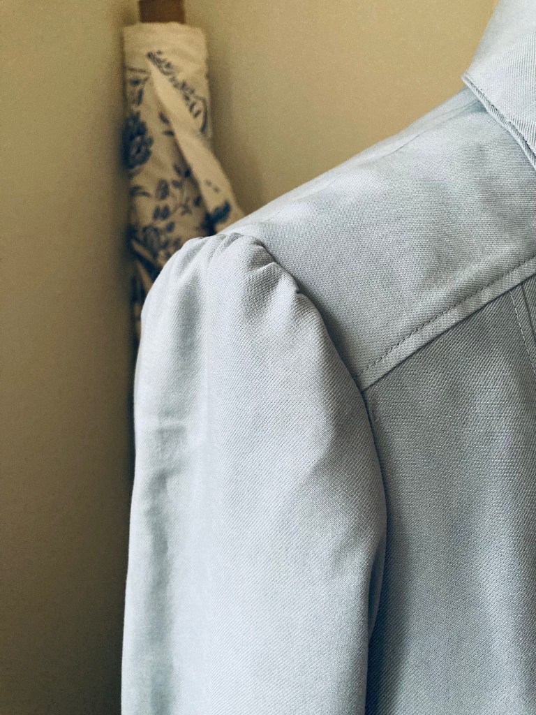 Of your 3 versions, the silver blue long shirtdress looks the most flattering and elegant (which isn’t the same as most comfortable to wear!). That bust gaping is aggravating, given that it only showed up in your sleeved version! If it doesn’t offend your sense of perfection in fit, you might wear a white T or tank under, and unbutton that button?