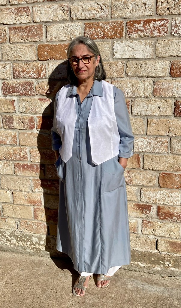I’d be reaching for the one on the left too. Everything about it works: the fit, the colors, the contrast detail, the fabric. The green: I’d release a few lower buttons and try with different pants (black or gray pants?). The blue is lovely I think you will love this one. Yes, shorten a bit. Release lower buttons below vest as the model is styling. Maybe with the button release you will not have to shorten.