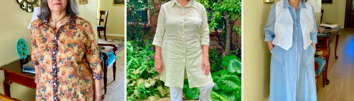 Thus we reach the end of the battle with these three shirts and a Happy Thanksgiving to all, the common features being the hallmark men’s shirt collar and front-buttoning band. The three quarter sleeves are my option for all three. Take a look and tell me what you think.