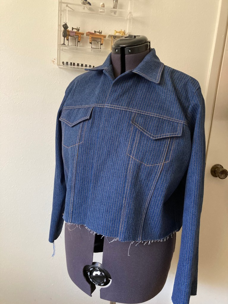 This is how far I have reached with the beginning piece of the great 2025 wardrobe plan; on the to-do list —- attach waistband and tabs, finish sleeve hems without cuffs, more topstitching, buttons and buttonholes.