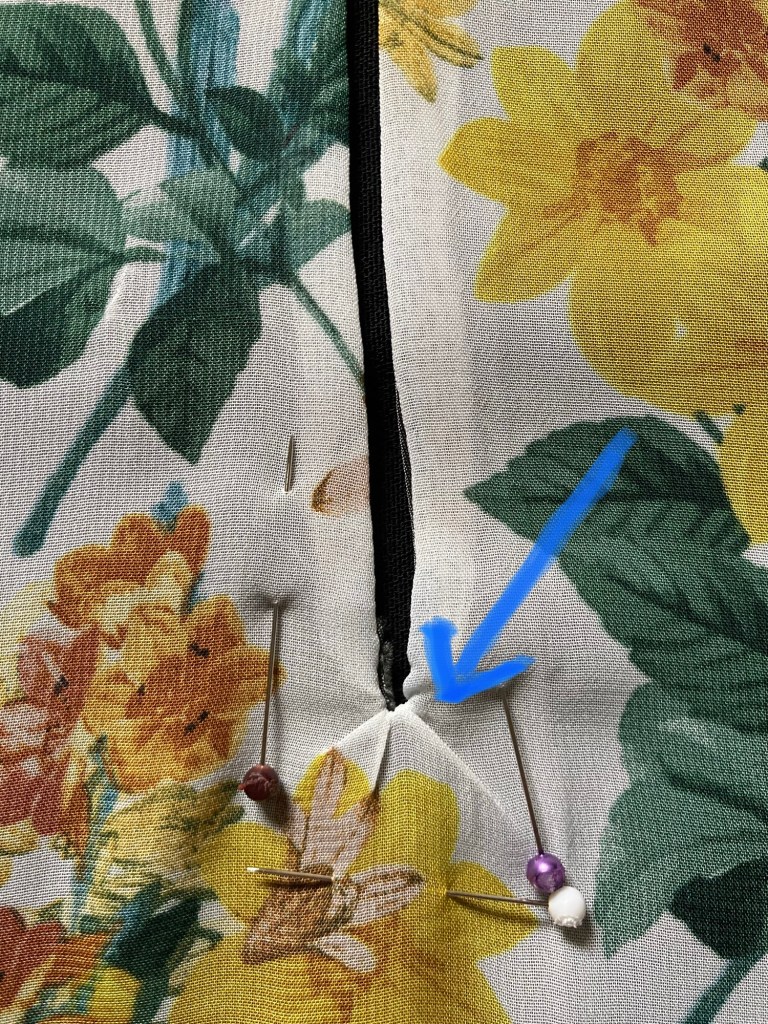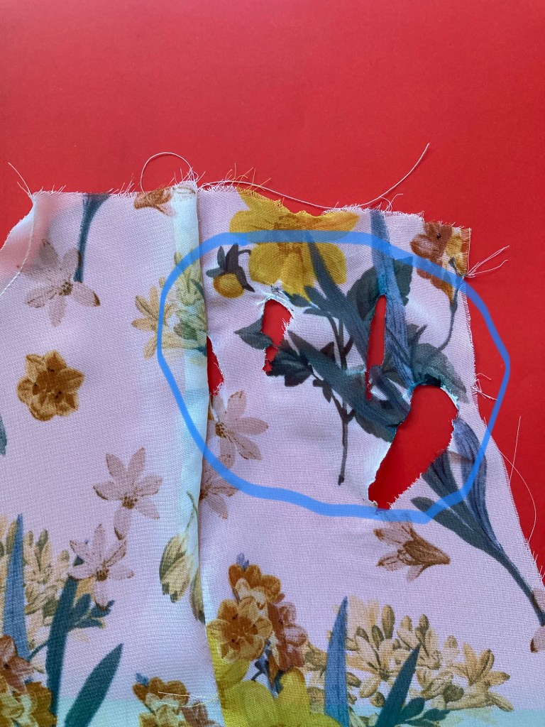 Normally, I would have wadded the whole thing but I did not. To solve the scorch issue, I used a scrap to match the flower print in that area and just hand sewed a patch — so there’s a visible seam in a weird place and that is OKAY. Probably very few nosy people will notice.