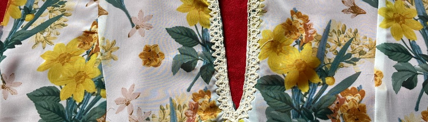 Then, I pulled out some lengths of lacy crotchet edging; this was the easiest and most straightforward option for the very sheer and VERY synthetic fabric. It was a gift from my dear friend who loved the fresh, daffodil print — I, too, love the print. I might have spent more time “mulling” if this was, say, a silk chiffon or georgette or another natural fiber. But I chose the path of least resistance and sewed on the lacy edging you are seeing. Again, pick your battles.