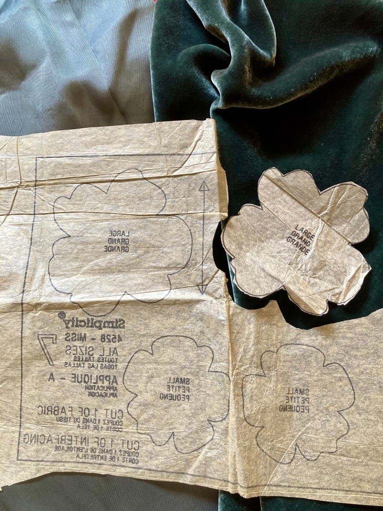 I mulled on a velvet flower appliqué or other doodad on the puckers; actually there was a flower pattern included in the pattern envelope! I pulled out coordinating silk velvet (leftover from an old project) and silky rayon twill (meant for lining) which would have worked. This option needed careful work; in the end, I decided that the weight of the velvet may pull down on the sheer, lightweight fabric.