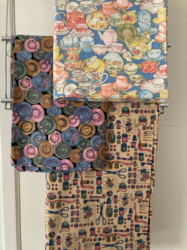 I do not deem these prints “conversational” because of the close repetition (tessellation?) which reads: flowery type of print — in spite of being teacups, hats and sewing notions — a “slice of my own life”. These three are quilting cottons. I mean, I’m a tea drinker, and I’m a sewing freak which elicited a visceral response to them, resulting in their addition to my stash. Will I ever use them in a quilt? If a garment, what will it be?