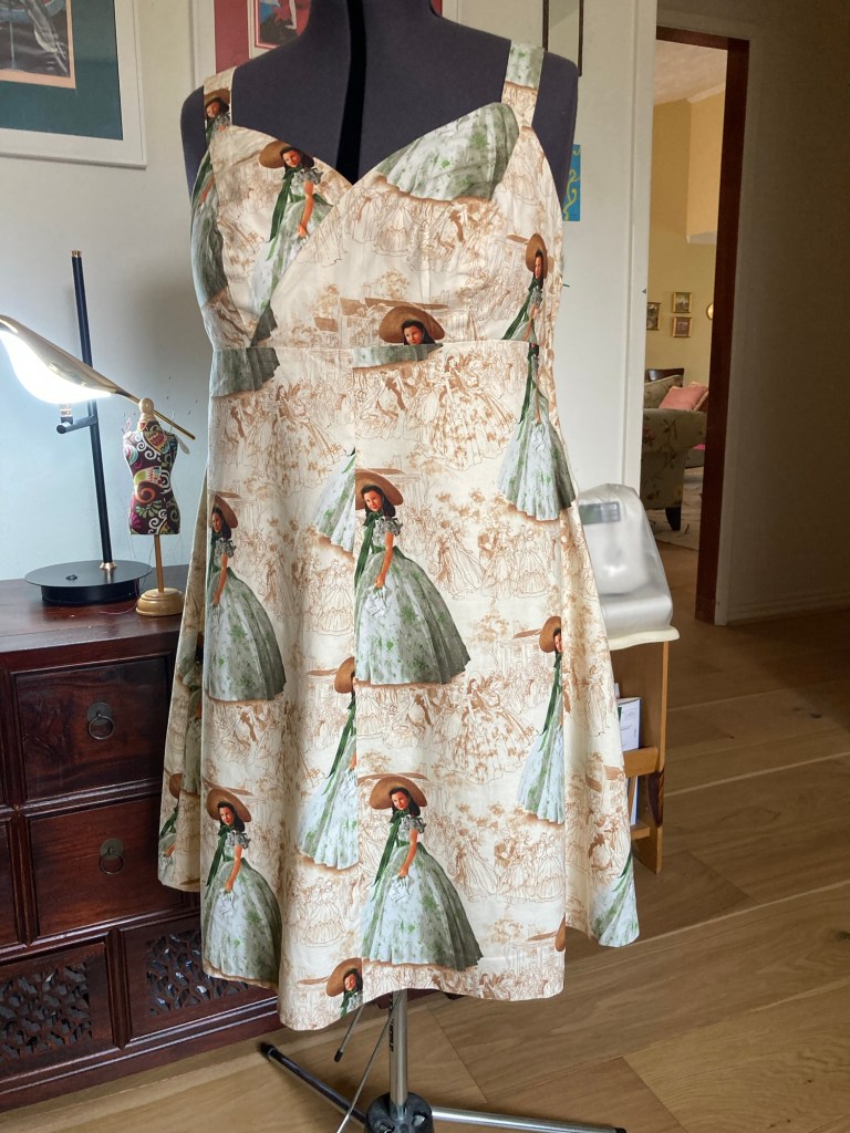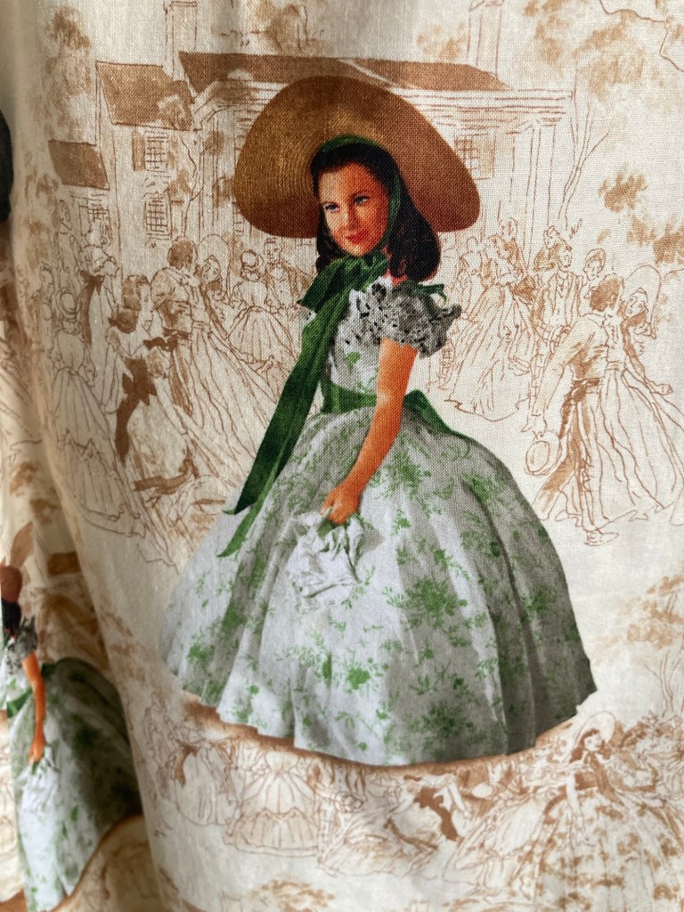 Spoiled, bratty southern belle, literary heroine Scarlet O’Hara is the focus of this print; I made this dress in the early aughts for the ASG Conference in Atlanta decades ago. Get it? Atlanta and Scarlet? However, I wore it just once with a white cardigan, because the bodice did not look right on me. The dress has been saved for an overdue refashion because I love this 100% cotton.