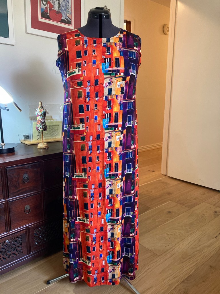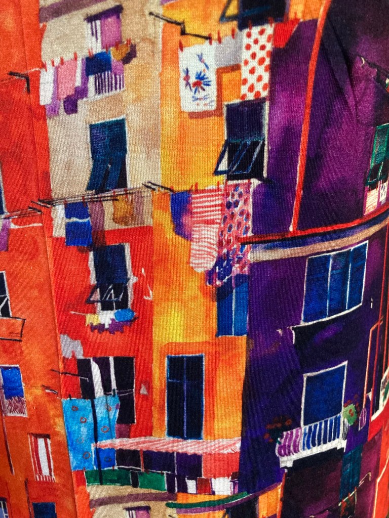 At first glimpse this print can read as a painterly abstract, that notion is quickly dispelled. It’s a slice-of-life in a high-rise. Can you spot the balcony plants? And, the laundry hanging off the balconies? So relatable. This “high rise” (I’d love to rename it “tenement”) print tank dress is awaiting a neckline finish and hem. It’s rayon knit and once completed, you’ll see it right here. So stay tuned. You can find the fabric online at Sew Much Fabric.