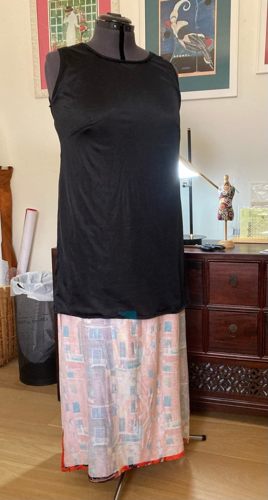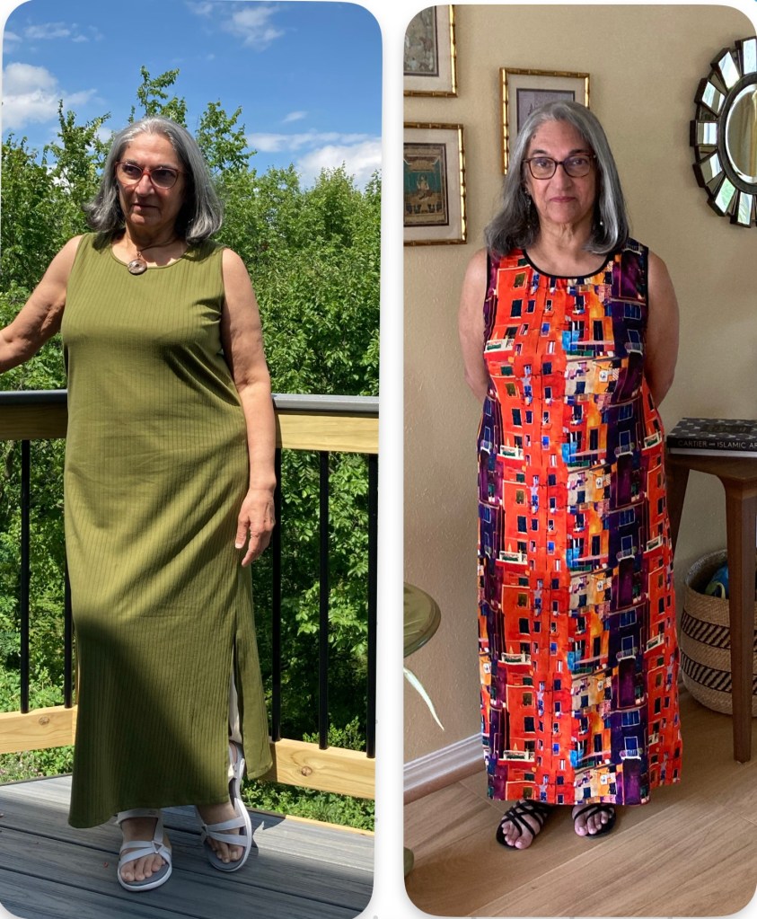 …… not even on the turned-up hem. I think it would have added too much thread on this lightweight knit — but that’s just my opinion. On the other hand, one could make the entire dress (or most of it) on a serger. Then, there is a different set of decisions to be made. We’ll visit those as I keep collecting tank style maxis. When you’re onto something you like, why not have lots of the same thing?