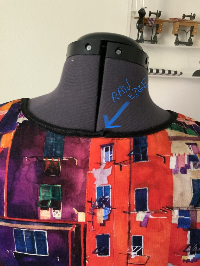 A) Folding the elastic edge inwards at the overlap point was bulky. So I left a raw edge at the overlap which was not a good idea either since the elastic does ravel; but this is what I ended up at the neck binding overlap anyway.