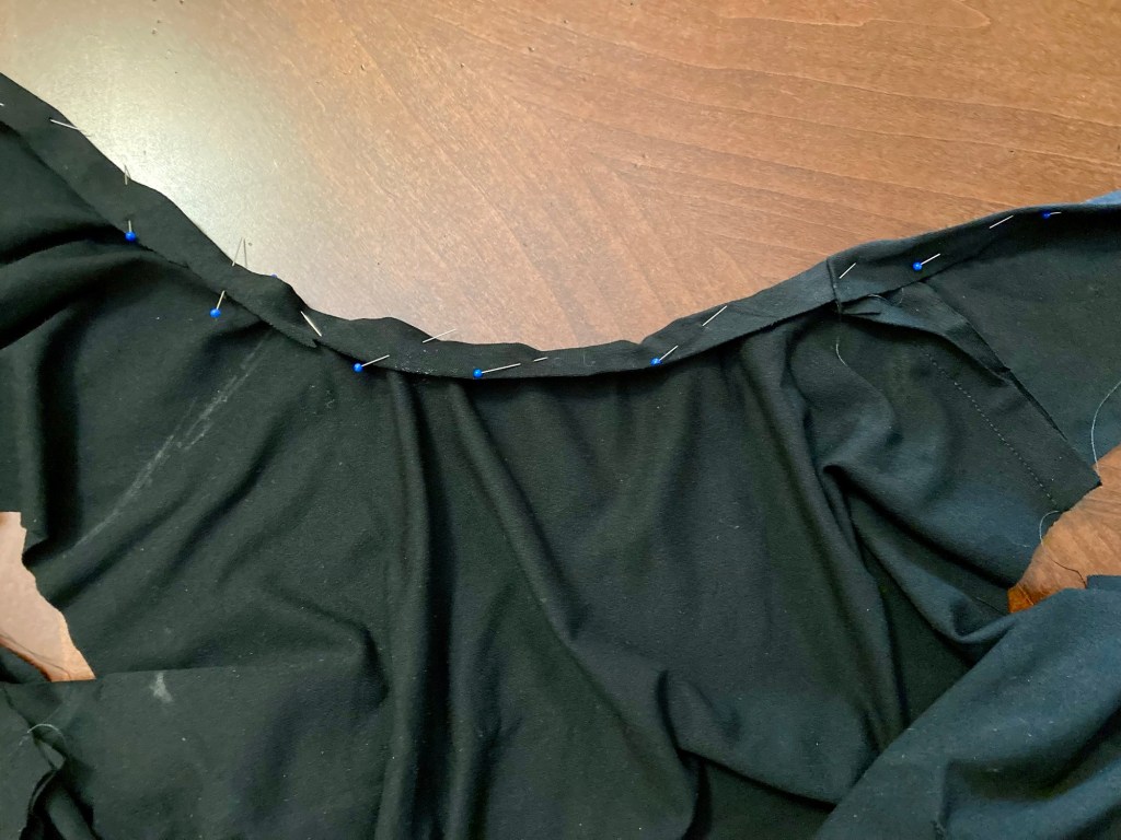 The most viable option now is cutting off the 5/8” neck-and front-wrap seam allowance and enclosing the edge in a fold over elastic. Another option is —- adding a gusset-like thing at the corners ostensibly to increase the cut-edge length to correspond with the inside edge. Third option is to snip open a couple of v-shapes somewhere in the edge; not sure how it’ll work. Fourth option and quite feasible: use a narrow strip of jersey to add a facing. Now my brain is starting to hurt, and I’ve decided to give it up for now.