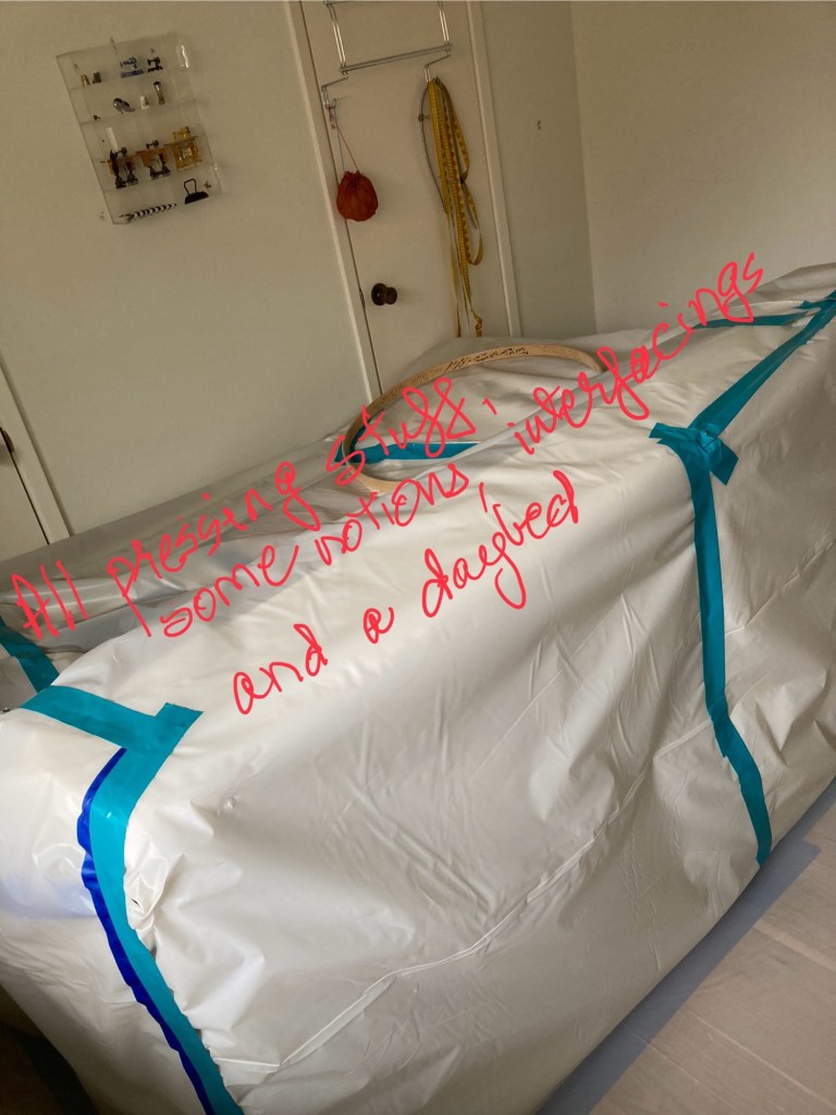 The pattern bins are in a blocked off shelf, except the Vogue Donna Karan tunic mentioned in a previous post (unfinished and disappointing as of now); also inaccessible are all interfacings and inner structure items; plus, all pressing equipment. An iron and small, portable ironing board were the only items I purchased cheaply to tide us over.