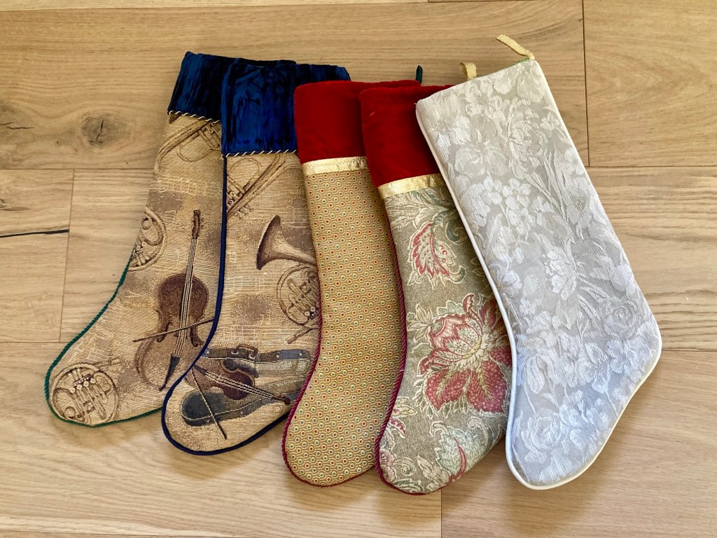 The painted Christmas tree card by my cousin, the woolly gnome knitted by my daughter; crafted with my own hands is the decades-old red/blue bauble made with folded fabric, styrofoam ball and lotsa tiny pins. I’ve lost the instructions to the bauble, so if anyone knows where I can find written instructions, let me know. Please. Oh hey, let’s not leave out these mantel stockings finally finished after eons living in my WIP stash (Work-in-Progress). I’ll hang up the rest next year…..