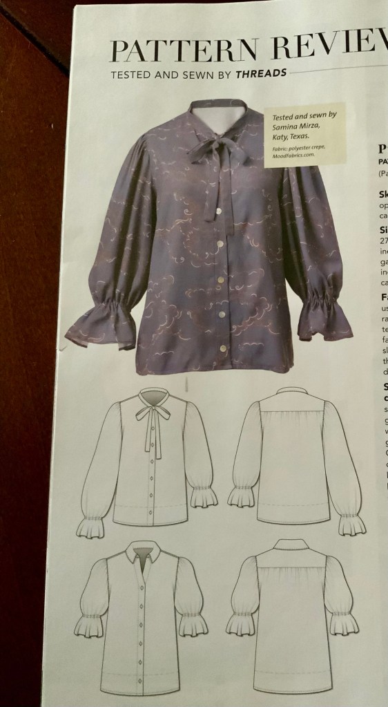 A very short post today. I reviewed the pattern for the melodiously named “Lyrical Blouse” and sewed a sample of this blouse for Threads magazine’s winter issue (available on newsstands now — do old fashioned newsstands still exist?), for inclusion in their Pattern Review section.